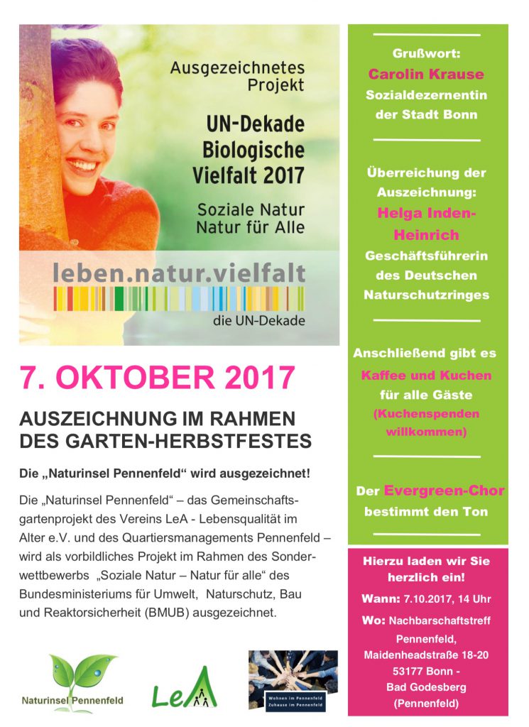 « Alle Veranstaltungen Diese Veranstaltung hat bereits stattgefunden. Gartenprojekt „Naturinsel Pennenfeld“ – Auszeichnung und Herbstfest Veranstaltung Navigation « Oktoberfest für Senioren im -Tenten- Haus der Begegnung Spazieren und Wandern in der Gruppe » Das Quartiersmanagement Pennenfeld und LeA e. V. laden ein! Zum Kalender hinzufügen Google Kalender iCalendar Outlook 365 Outlook Live Details Datum: 7. Oktober 2017 Zeit: 14:00 Veranstaltungsort Nachbarschaftstreff Pennenfeld Maidenheadstr. 20 53177 Bonn, Deutschland Telefon: 0228 9158-444 Webseite: Veranstaltungsort-Website anzeigen